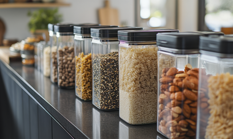 Зона хранения продуктов: для круп, макарон, сахара и других сыпучих продуктов используйте контейнеры с герметичными крышками.