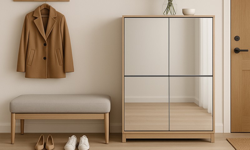 Более элегантный вариант — обувница с откидными секциями. Внутри обувь располагается под небольшим наклоном, освобождая дополнительный объём, а закрытый фасад скрывает всё, что вы не хотите выставлять напоказ.